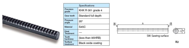 | SROCP2.5-500 | $81.62 | CAD N/A | Module N/A 0.7958 | Circular Pitch N/A 2.5 | Effective Number of Teeth N/A 200 | Shape N/A R2 | Total Length Rack (A) N/A 19.882 in505 mm | Outer Diameter (d) N/A 0.394 in10 mm | Height To Pitch Line (D) N/A 0.362 in9.2 mm |