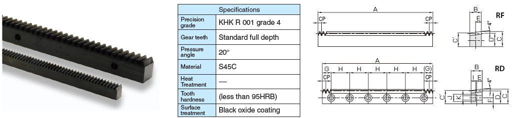 Module N/A 1.5915 | Effective No. of Teeth N/A 200 | Shape N/A RF | Total Length Rack (A) N/A 39.370 in1000 mm | Face Width (B) N/A 0.591 in15 mm | Height (C) N/A 0.768 in19.5 mm | Height To Pitch Line (D) N/A 0.684 in17.38 mm |