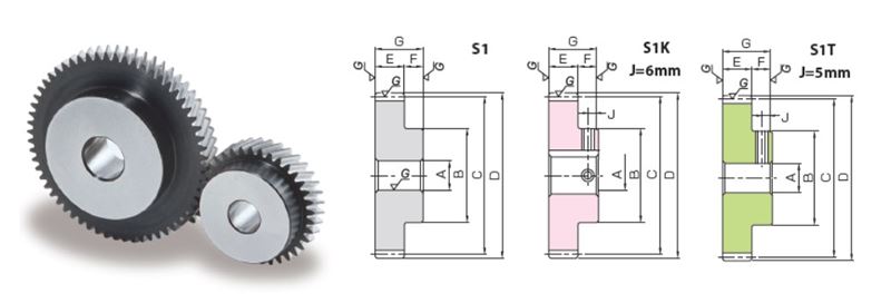Bore Type N/A Finished | Transverse Module N/A 1 | No. of Teeth N/A 100 | Direction of Helix N/A Right Hand | Shape N/A S1K | Bore Diameter (A) N/A 1.102 in28 mm | Pitch Diameter (C) N/A 3.937 in100 mm | Outer Diameter (D) N/A 4.016 in102 mm | Total Length (G) N/A 0.709 in18 mm |