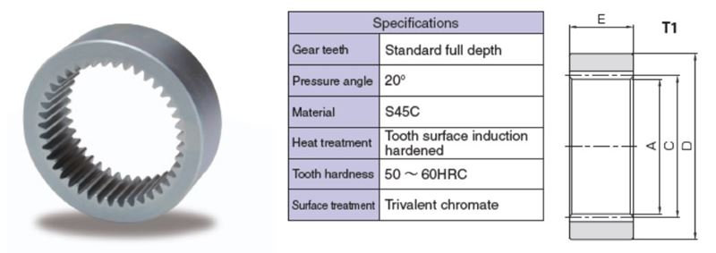 Module N/A 2.5 | No. of teeth N/A 42 | Internal Diameter (A) N/A 3.937 in100 mm | Pitch Diameter (C) N/A 4.134 in105 mm | Outer Diameter (D) N/A 5.709 in145 mm |