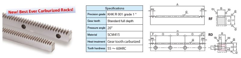 Has the highest strength and precision in the KHK standard rack series. Bolt holes can be remachined as carburizing is applied only within the tooth area. J Series products are also available.