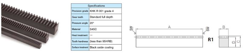 Module N/A 1 | Effective No. of Teeth N/A 159 | Shape N/A R1 | Total Length Rack (A) N/A 19.882 in505 mm | Face Width (B) N/A 0.394 in10 mm | Height (C) N/A 0.472 in12 mm | Height To Pitch Line (D) N/A 0.433 in11 mm |