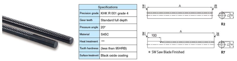 Module N/A 2 | Effective Number of Teeth N/A 64 | Shape N/A R7 | Total Length Rack (A) N/A 19.882 in505 mm | Outer Diameter (d) N/A 0.787 in20 mm |