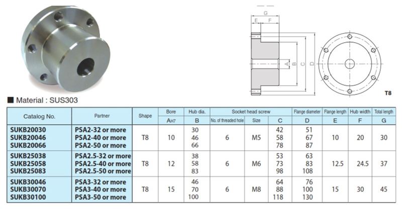 | SUKB30070 | $232.93 | CAD N/A | Bore Diameter (A) N/A 0.591 in15 mm | Hub Diameter (B) N/A 2.756 in70 mm | Flange Diameter (D) N/A 3.937 in100 mm | Hub Width (F) N/A 1.181 in30 mm | Total Length (G) N/A 1.772 in45 mm |